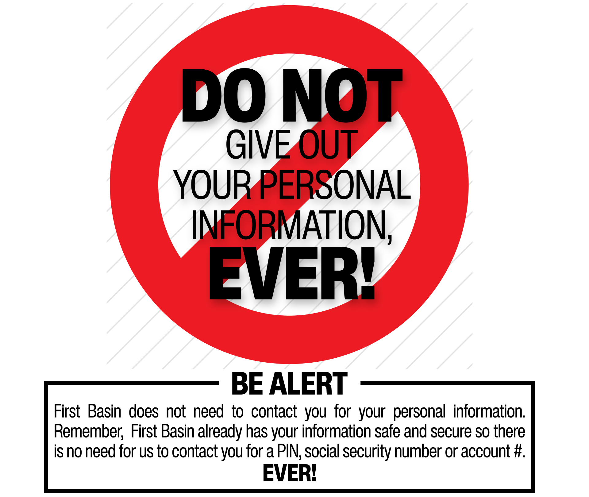 Why would First Basin need to call, text or email for your personal information? WE DON'T! First Basin Credit Union already has all member information stored securely and will NEVER contact you requesting personal, confidential information. Be alert, fraudsters are smart! Even if a phone number appears as a First Basin number or an email looks authentic it may very well be a fraud. This is why you simply need to remember one basic rule of thumb - First Basin already has your information and will never call, text or email requesting an account or PIN number, full social security number or any personal account information. We got that!